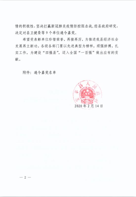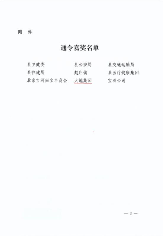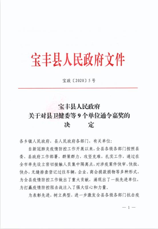 日前,县政府专门下发嘉奖令,对全县疫情防控工作中涌现出的先进单位予以表彰,米兰网站因工作成绩突出、贡献重大,受到县政府的通令嘉奖。 面对突如其来的新冠肺炎疫情,大地集团迅速行动,坚决把职工的身体健康和生命安全放在首位。在不折不扣地执行省、市、县新冠肺炎疫情防控命令的同时,结合自身实际,周密部署,狠抓落实。第一时间成立了新冠肺炎疫情联防联控工作领导小组,制定了详细的《疫情防控方案》和《疫情应急预案》。集团各部门、各公司认真落实各项防控措施,步调一致、严防坚守,疫情防控和复工复产工作均紧张有序地进行。 大地集团始终弘扬公益精神,积极承担社会责任。新冠肺炎疫情发生以来,大地集团高度关注,在做好自身防控工作的同时, 2月1日下午,集团向河南省慈善总会捐助现金1000万元人民币,用于平顶山市和宝丰县疫情防控工作,为打赢这次疫情防控攻坚战贡献一份力量。