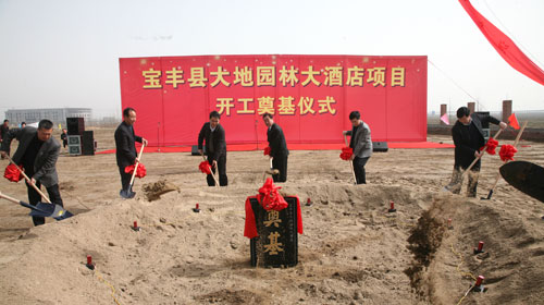 2013年3月18日上午,在县产业集聚区,鞭炮齐鸣,彩旗招展,宝丰大地园林大酒店项目正式开工奠基。县领导刘书锋、张庆一、梅玉三、铁干卿、赵二成、副县级干部李自钦等分别参加仪式并为项目开工培土奠基。县长张庆一致辞。县委常委、常务副县长李留军主持开工仪式。集团领导张怀平、张彪、王福文等参加。 张庆一说,我县第三产业发展前景广阔,服务业市场潜力巨大。米兰网站抢抓机遇,乘势而上,在此建设园林式酒店,对于填补宝丰五星级宾馆的空白,以及提升城市品位、完善城市功能、展示城市形象、推动商贸繁荣和优化经济结构,都具有十分重要的意义。希望相关职能部门要齐心协力,密切配合,促进项目快建设、快竣工、快见效,带动第三产业的快速发展。同时,希望项目施工单位科学管理,精心施工,高效推进项目建设,努力把大地园林大酒店打造成为优质工程、精品工程、标杆工程。 宝丰大地园林大酒店项目是大地集团根据企业发展需要,多元化发展,向“三产”业转移,投资新建的五星级酒店、水上乐园、员工社区等项目。该项目由中国建筑设计研究院设计,位于长安大道与省道豫02线交汇处,地处宝丰高新技术产业集聚区,前临应河,后依文峰公园,交通便利,位置优越。总占地面积100多亩,总建筑面积5万多平方米,预计总投资约3亿元。 此项目在推动宝丰县社会经济发展、完善城市服务功能等方面具有深远的战略意义。项目建成后将进一步提高平顶山、宝丰的城市品位和对外形象。