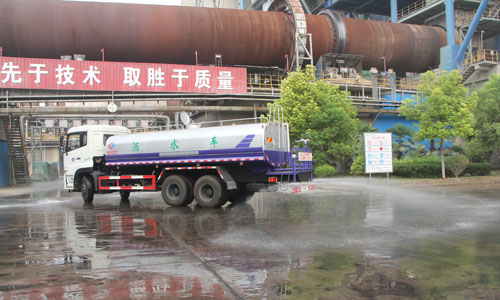 洗扫车定时清扫 三、为进一步建设良好的路域环境,公司加强运输车辆管理,制定运输车辆管理制度。要求运输车辆按规定装载,严禁超限车辆出场。对散装水泥等散装物料实行密闭运输。对煤炭、物料运输车辆加盖篷布等进行运输过程全覆盖,避免运输过程中脱落抛洒、遗落。设置限速标志,要求进厂原料运输车辆减速慢行,避免道路扬尘的产生。同时,公司投资10多万元,安装设置全自动洗车机,要求进出厂车辆轮胎及底盘部位必须清洗,不允许带泥上路。 保护环境,责无旁贷。按照环保先行的企业决策,大地公司继续把“绿水青山就是金山银山”的环保理念贯彻于生产全过程,充分发挥区域龙头企业的带动作用,高标准、严要求,持续加大环保治理投入,以超低排放为目标,以打造“绿色标杆”企业为已任,推进环保工作再上新台阶。